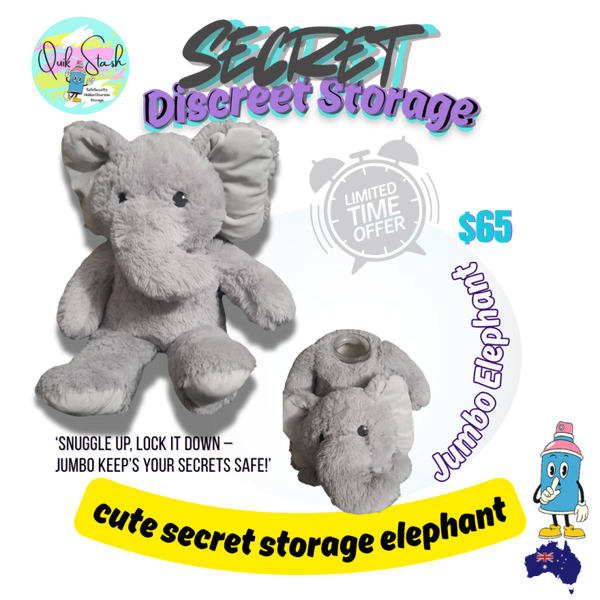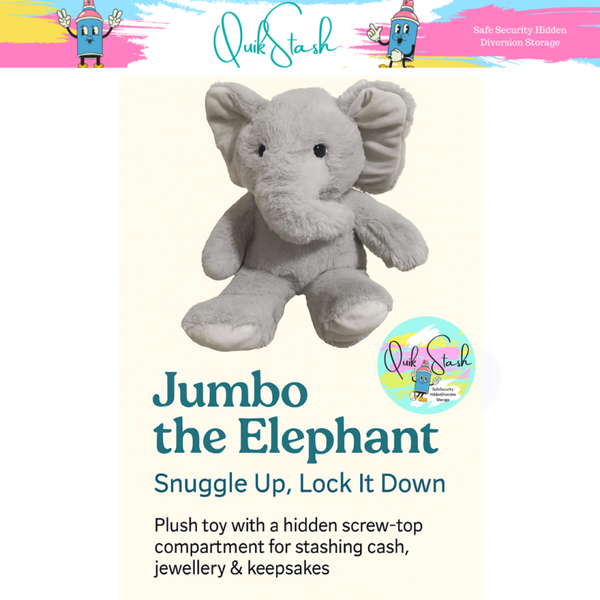 Discover Jumbo the Elephant – the ultra-cute plush toy with a hidden screw-top storage compartment. Perfect for hiding money, jewellery, keys & keepsakes in plain sight. The ultimate safe gift idea for kids, teens & adults.